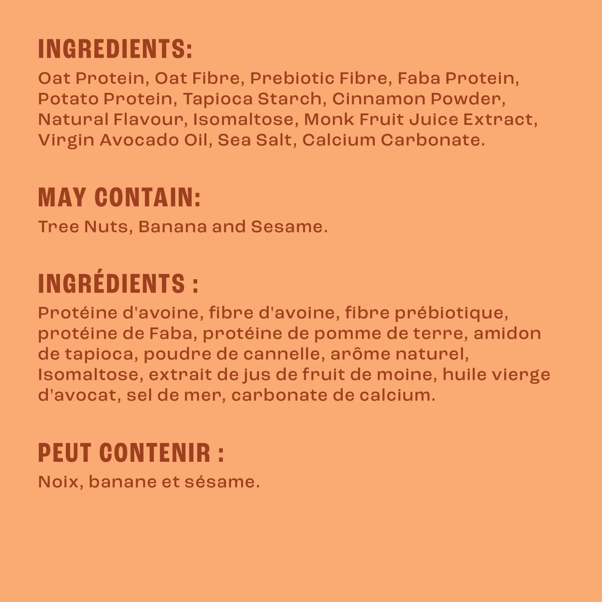 Ingredients: Oat Protein, Oat Fibre, Prebiotic Fibre, Faba Protein, Potato Protein, Tapioca Starch, Cinnamon Powder, Natural Flavour, Isomaltose, Monk Fruit Juice Extract, Virgin Avocado Oil, Sea Salt, Calcium Carbonate.