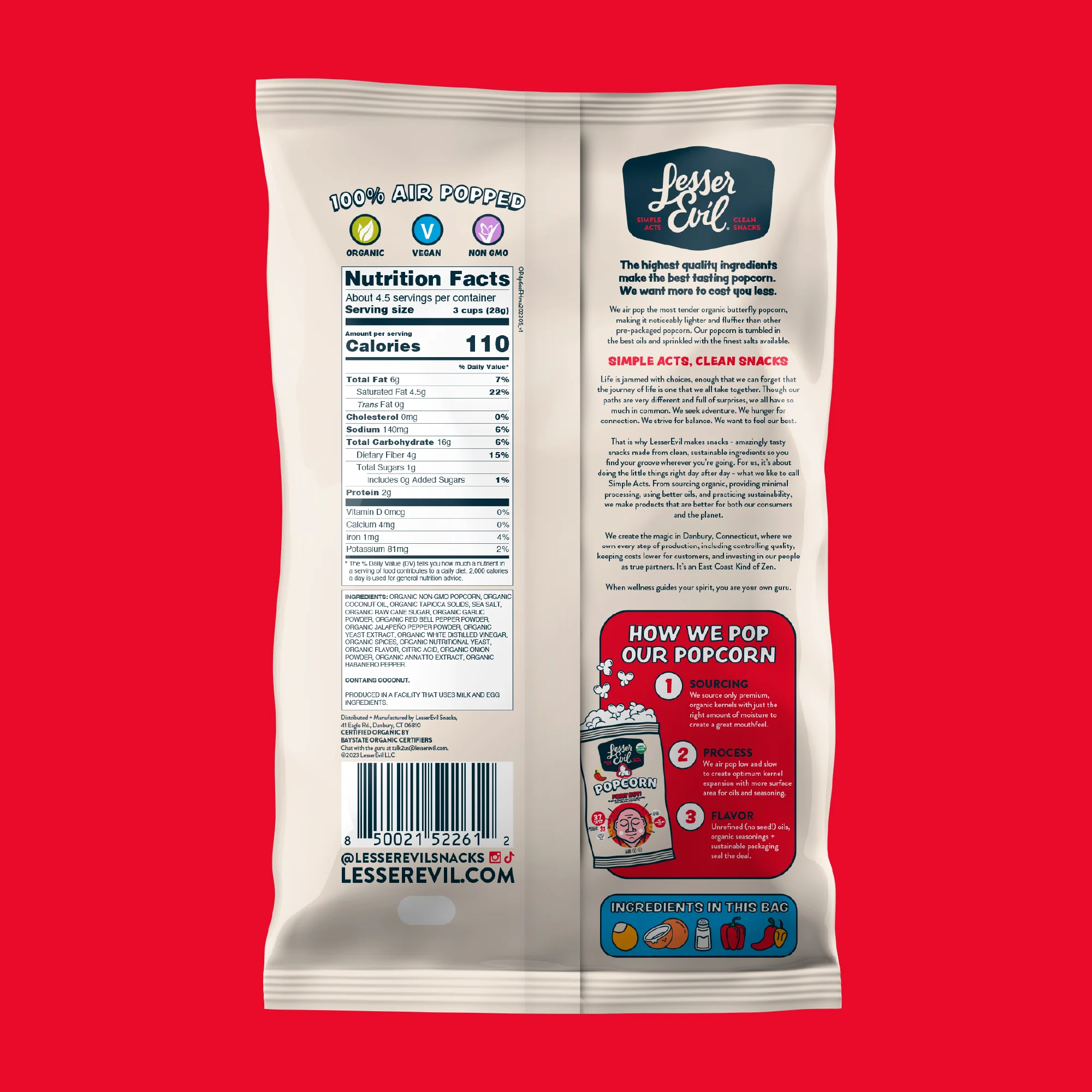 Ingredients: Organic NON-GMO popcorn, Organic Coconut Oil, Organic Tapioca Solids, Sea Salt, Organic Raw Cane Sugar, Organic Garlic Powder, Organic Red Bell Pepper Powder, Organic Jalapeño Pepper Powder, Organic Yeast Extract, Organic White Distilled Vinegar, Organic Spices, Organic Nutritional Yeast, Organic Flavor, Citric Acid, Organic Onion Powder, Organic Annatto Extract, Organic Habanero Pepper