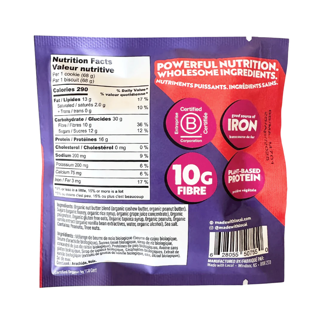 Want a delicious pick-me-up? These high protein nut butter cookies in peanut butter & sea salt flavour will do the trick! Packed with 16g protein and 10g fibre, Made With Local nut butter cookies are your escape from snack cravings. These cookie-licious soft-baked treats will keep you full without harmful ingredients. Also, they are gluten-free and completely organic so that you can enjoy them worry free. The nostalgic flavours will take you back to your childhood when grandma would bake delicious soft cookies at home.