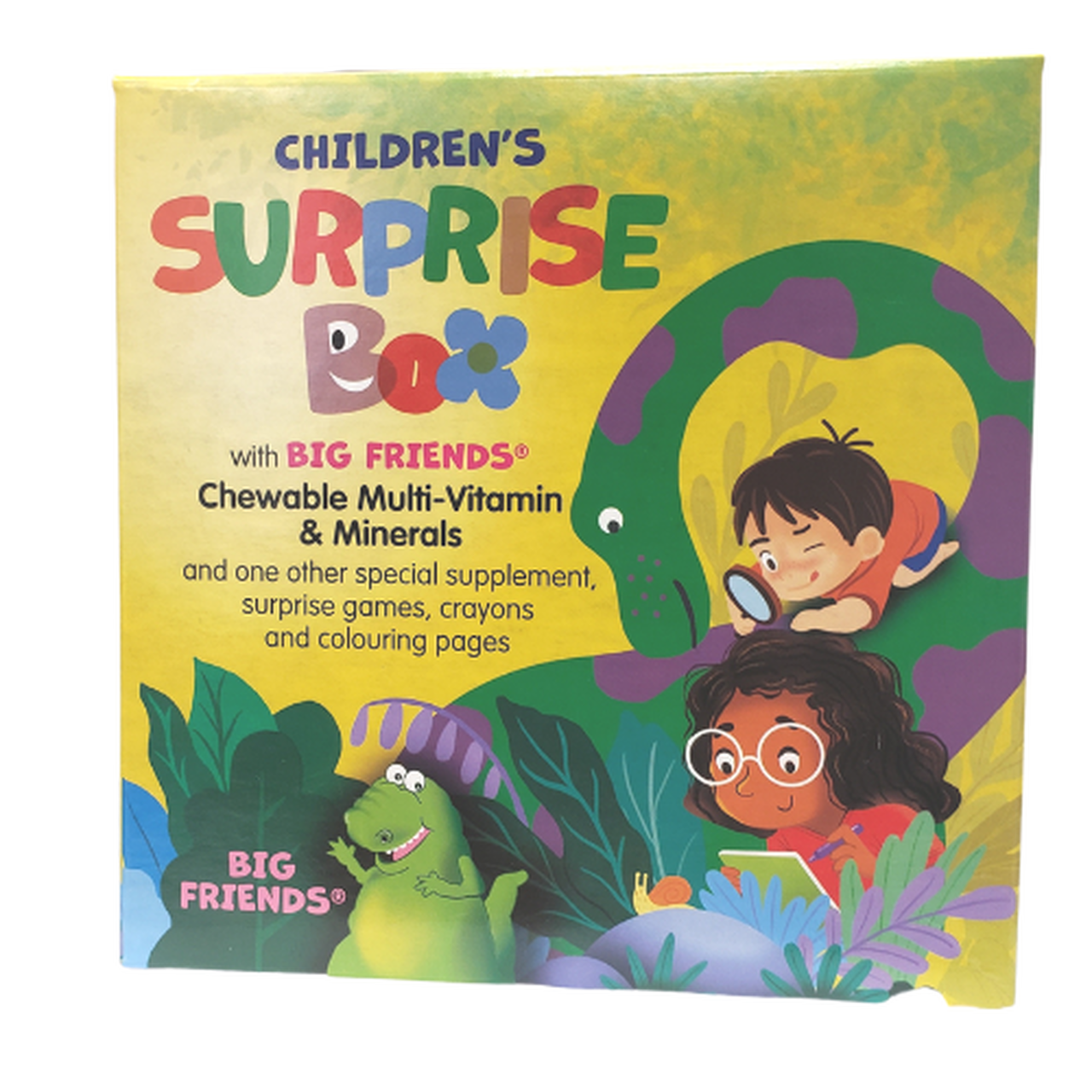 Natural Factors Big Friends Children's Surprise Box contains Big Friends Chewable Multi-Vitamin & Minerals, Big Friends Chewable Vitamin D3, and colouring pages.