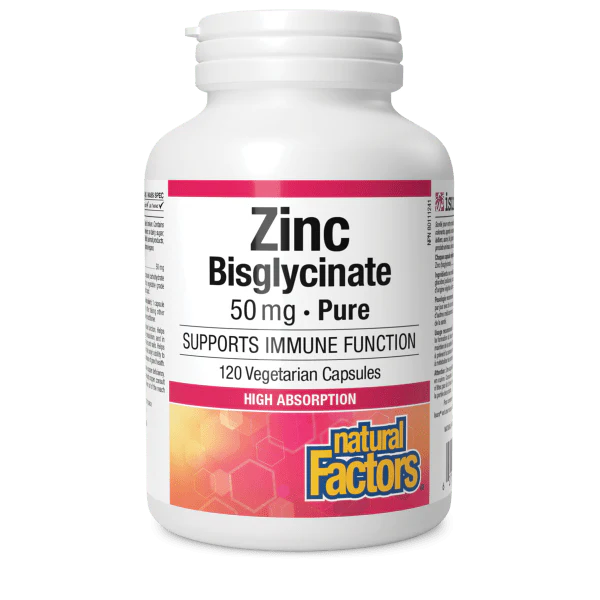 Natural Factors Zinc Bisglycinate is an essential trace mineral that supports the immune system and helps maintain the body’s ability to metabolize nutrients. Zinc is important for connective tissue formation and helps maintain healthy skin, hair, nails, and bones. Zinc bisglycinate is a gentle form that does not upset the stomach. This one-per-day formula contains 50 mg of elemental zinc in the highly absorbable bisglycinate form that does not rely on stomach acidity to be absorbed.