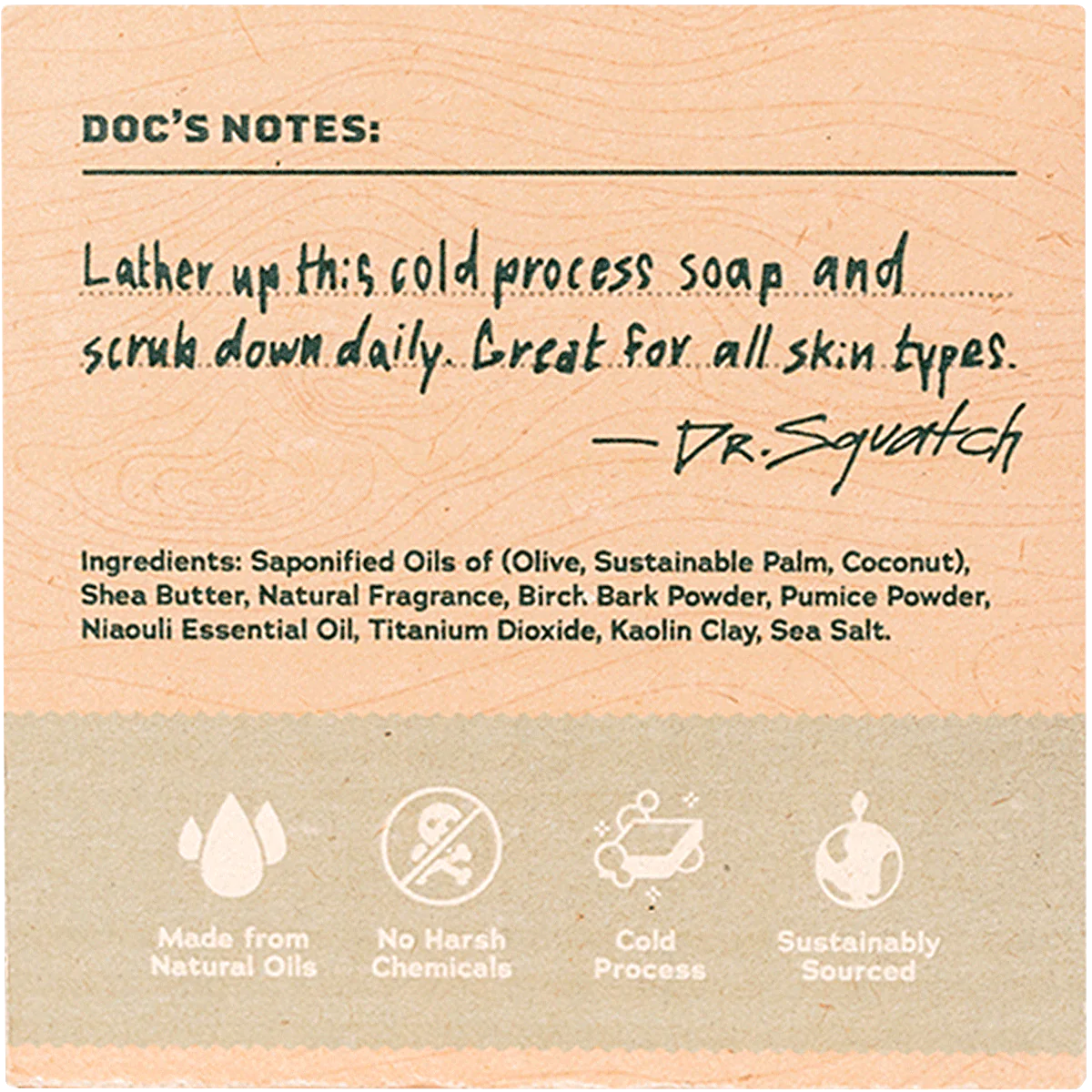 Ingredients: Saponified Oils of (Olive, Sustainable Palm, Coconut), Shea Butter, Natural Fragrance, Birch Bark Powder, Pumice Powder, Niaouli Essential Oil, Titanium Dioxide, Kaolin Clay, Sea Salt
