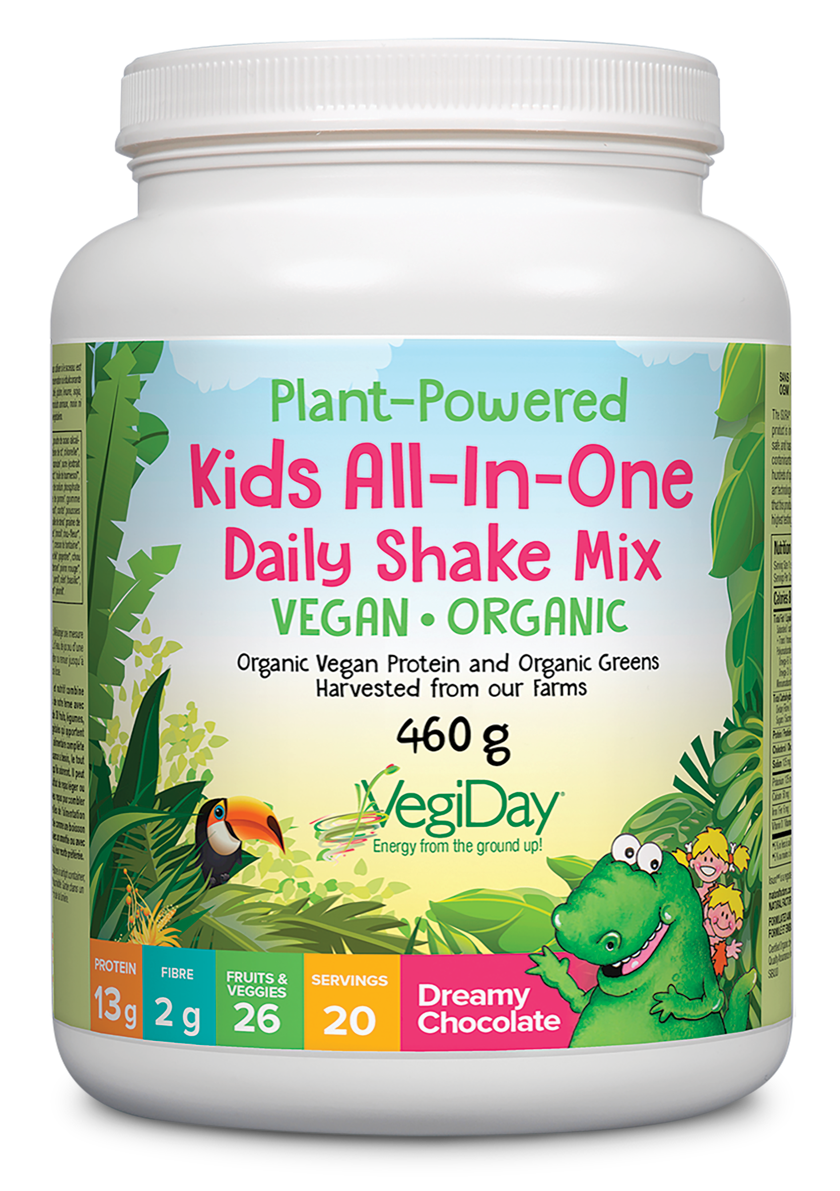 Raw, Organic, Vegan Protein and Greens for Kids. Kids All-In-One Daily Shake Mix is delicious, nutritious, and certified organic. Each scoop contains farm-fresh greens with a rainbow of more than two dozen wholesome fruits, veggies, herbs, and VegiDay® plant-powered protein. Add it to a smoothie for a tasty snack between meals, or mix with oatmeal or your child’s favourite recipe for extra plant-powered nutrition.